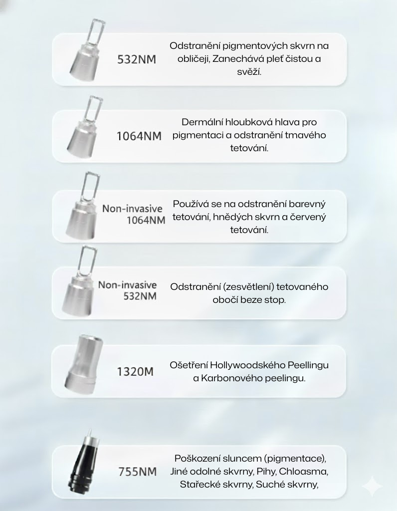 • 1320 nm – Hlavice pro Hollywood Peel / Carbon Peel – omlazující procedura, která čistí póry, zlepšuje texturu pleti a dodává jí jas.
